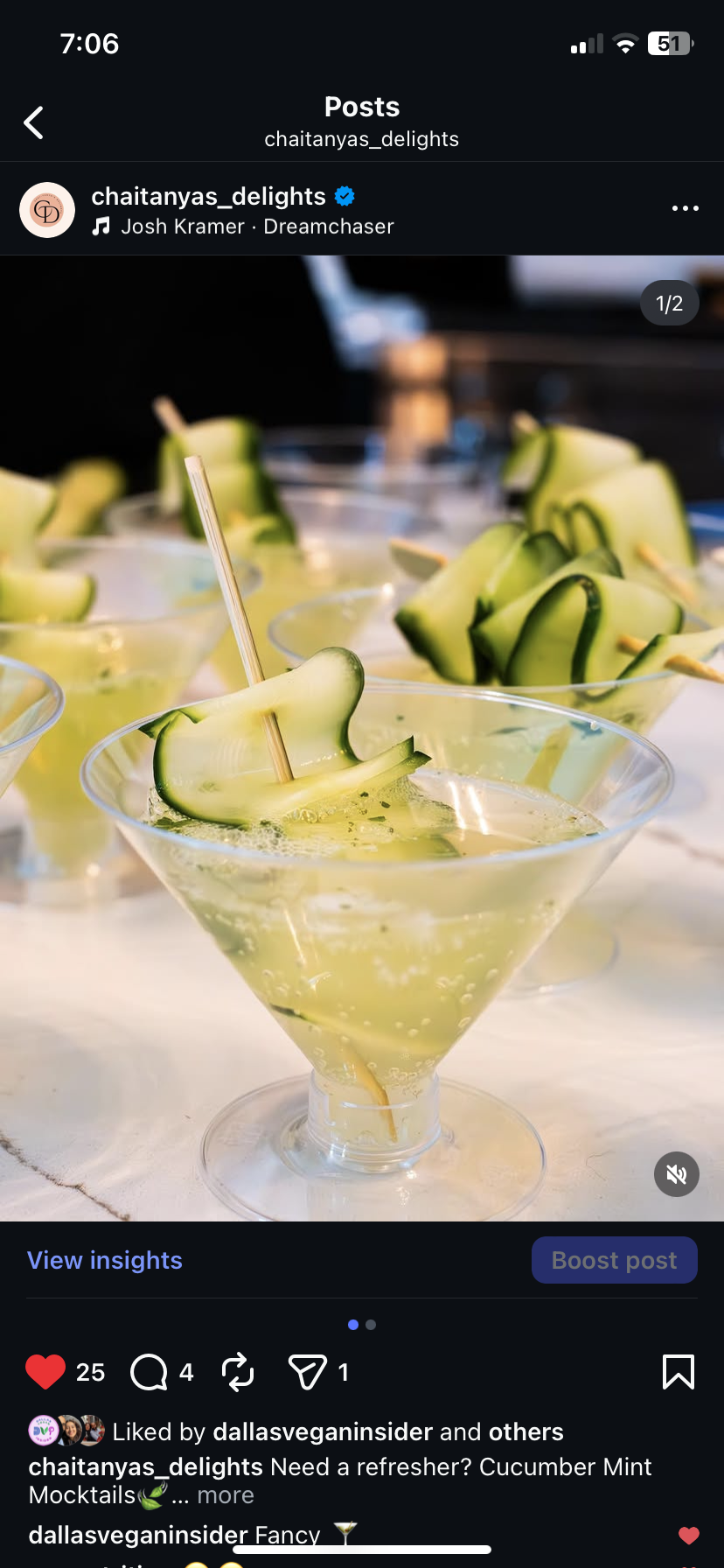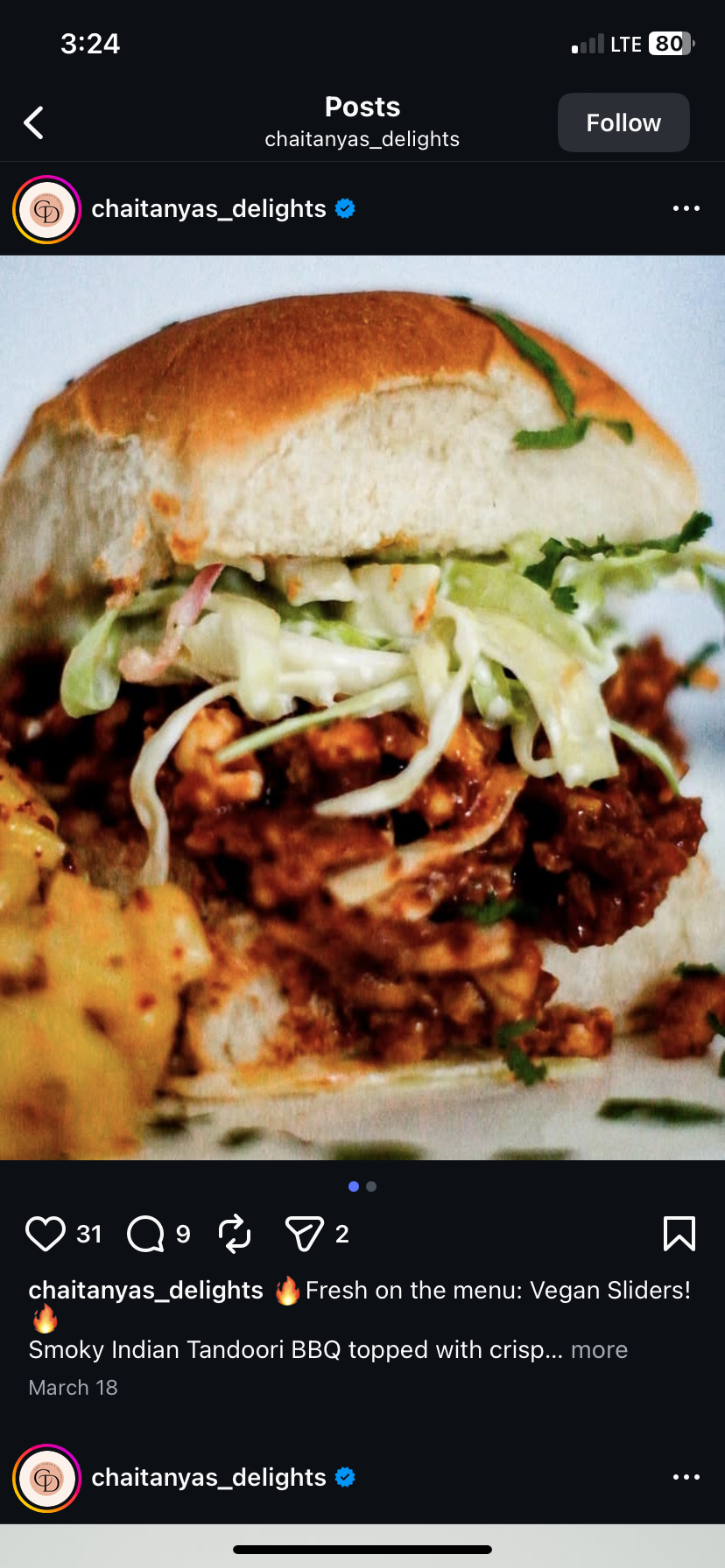Chaitanya’s Delights went from 276 followers to 3.5K followers within 6 months. Nearing 9 months Reels were averaging from 2 – 3K views, with 30 – 50 likes per post.